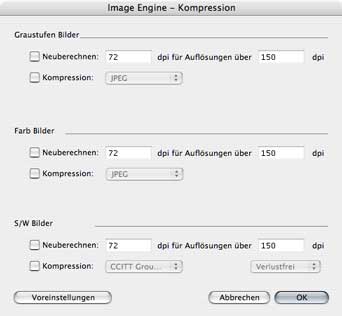 " Schaltfläche zu betätigen. Der Kompression-Dialog ermöglicht die separate Einstellungen für die Neuberechnung und Kompression jeweils für Graustufenbilder, Farbbilder und S/W-Bilder getrennt.