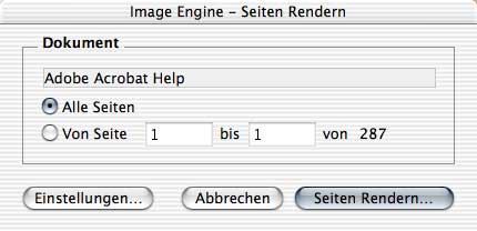 Nun erscheint der Dokument-Dialog, mit dem eingestellt wird, ob die Funktion auf das gesamte Dokument oder einen Bereich zusammenhängender Seiten angewendet werden soll. Es ist ein Schaltfläche für das Ändern der Einstellungen Seiten Rendern Funktion vorhanden.
