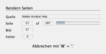 ImageEngine zeigt nun ein Fenster mit einer Fortschrittsanzeige. Die Seiten Rendern Funktion kann durch Betätigen der Tastenkombination "Befehl" + "." oder der "esc"-Taste abgebrochen werden. In diesem Fall bleiben alle bereits erzeugten Bilddateien im Ausgabordner erhalten.