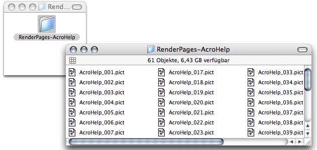 Die Seiten Rendern-Funktion verwendet das Render-Verfahren der Adobe Acrobat Applikation, um die Seitenansichten des Ausgangsdokumentes als Bilder zu gewinnen. Die Bilder werden entweder als Macintosh Pictures oder im Format eines der QuickTime Bild-Exporter des Mac OS gespeichert.