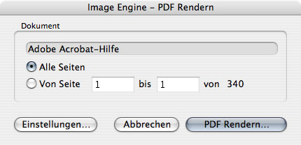 Nun erscheint der Dokument-Dialog, mit dem eingestellt wird, ob die Funktion auf das gesamte Dokument oder einen Bereich zusammenhängender Seiten angewendet werden soll. Es ist ein Schaltfläche für das Ändern der Einstellungen PDF Rendern Funktion vorhanden.