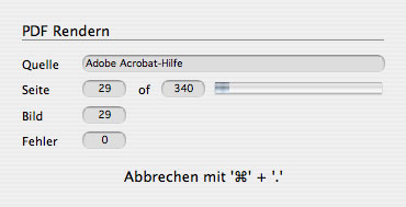 ImageEngine zeigt nun ein Fenster mit einer Fortschrittsanzeige. Die PDF Rendern Funktion kann durch Betätigen der Tastenkombination "Befehl" + "." oder der "esc"-Taste abgebrochen werden. In diesem Fall bleiben alle bereits erzeugten Bilddateien im Ausgabordner erhalten.