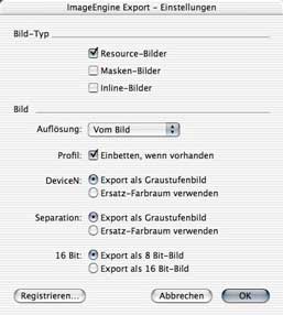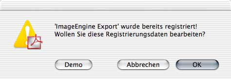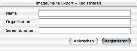 Achtung: Um ImageEngine Export an einem Computer zu registrieren, der sowohl unter Mac OS 9 als auch Mac OS X verwendet wird, ist es erforderlich ImageEngine Export für jedes OS separat zu registrieren.