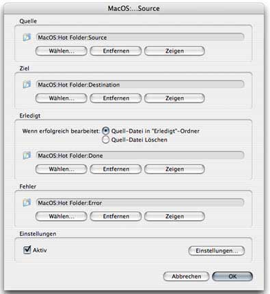 Achtung: Statt der Originaldatei kann auch eine Alias-Datei, die auf die zu verarbeitenden PDF-Datei zeigt, in den Quell-Ordner gelegt werden. Beim Vorfinden einer Alias-Datei wird versucht, die Originaldatei zu finden, um diese zu verarbeiten. Bei aktivierter Option "Quell-Datei Löschen" wird die Alias-Datei, nicht jedoch die Originaldatei gelöscht.